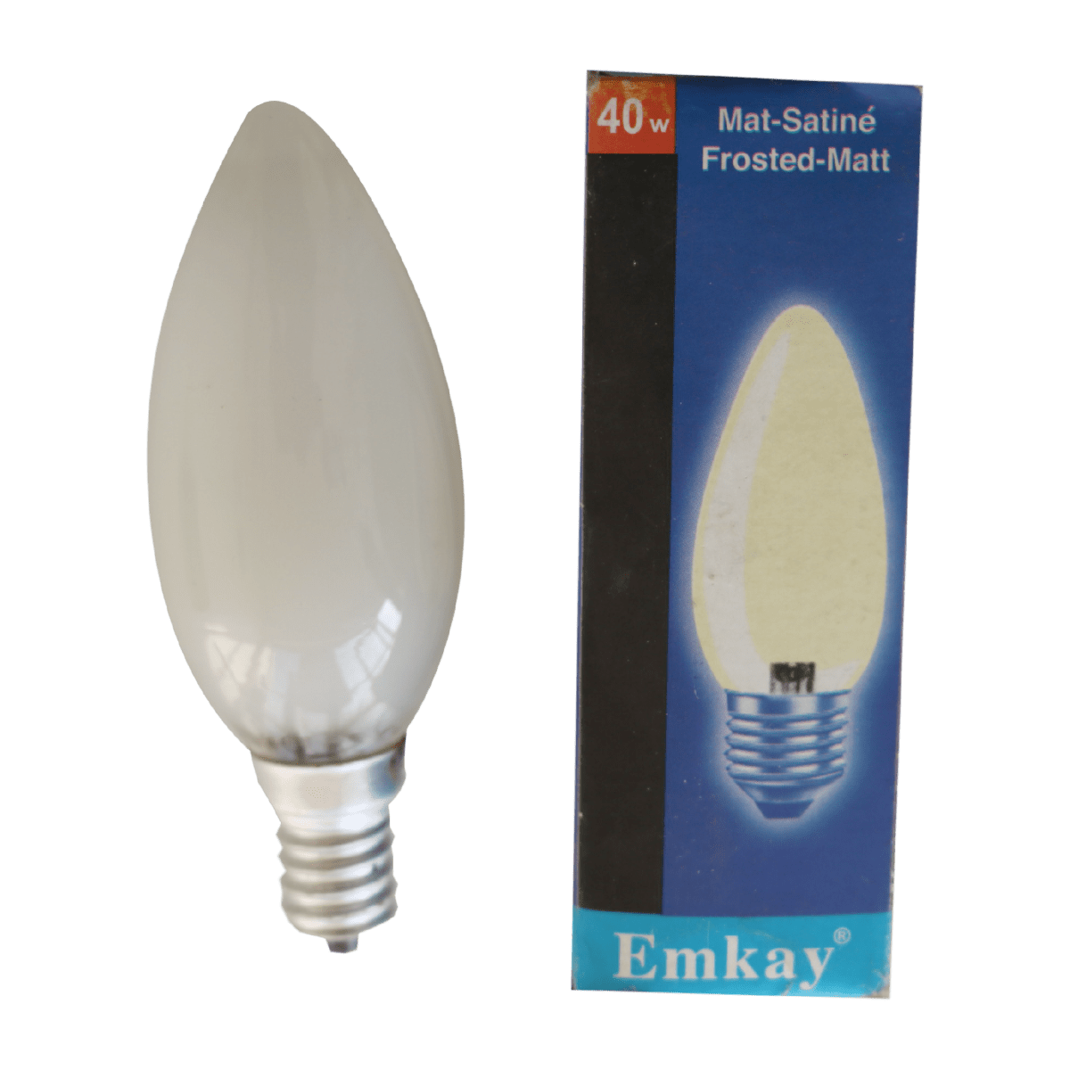 Emkay matine-satine frosted matt 40W candle bulb. Used in chandeliers, desk lamps and wall lights